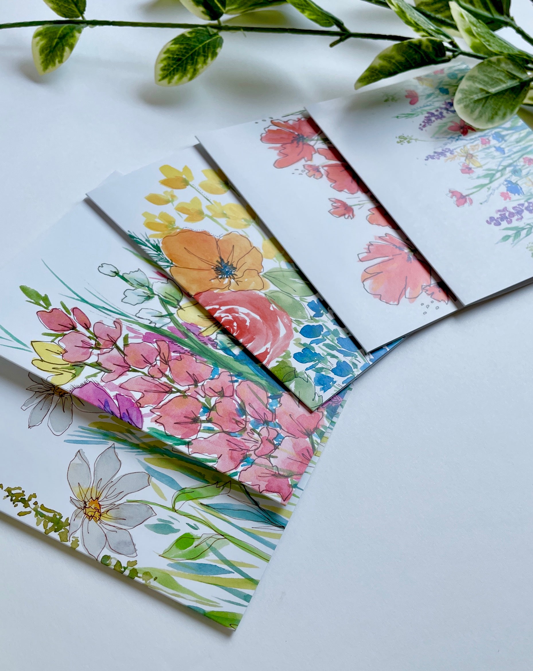 10 beautiful notecards with envelopes, with five different designs. Each card is a print of one of my original watercolor paintings. These cards come directly from the artist to you!